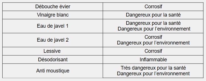 5) Pourquoi les deux eau de javel sont des pictogrammes différents ?